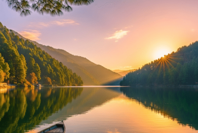 Begin in Nainital, the “Lake District of India,” with its serene Naini Lake rippling softly under a pastel sky. Drift across the glassy water in a quaint boat, surrounded by reflections of pine‑fringed hills. Climb up to Snow View Point or Tiffin Top for panoramic views of snow‑capped peaks rising like silent sentinels—pure, majestic, and timeless.